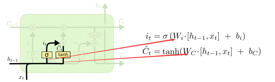 然后是信息增加门,决定了什么新的信息到细胞状态中: