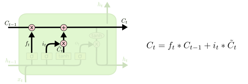 其中,sigmoid决定了什么值需要更新,tanh创建一个新的细胞状态的候选向量Ct,该过程训练两个权值Wi和Wc。经过第一个和第二个门后,可以确定传递信息的删除和增加,即可以进行“细胞状态”的更新。