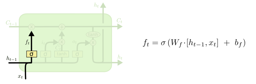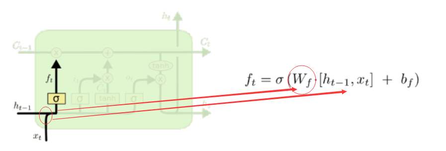 如上,忘记门中需要注意的是,训练的是一个wf的权值,而且上一时刻的输出和当前时刻的输入是一个concat操作。忘记门决定我们会从细胞状态中丢弃什么信息,因为sigmoid函数的输出是一个小于1的值,相当于对每个维度上的值做一个衰减。