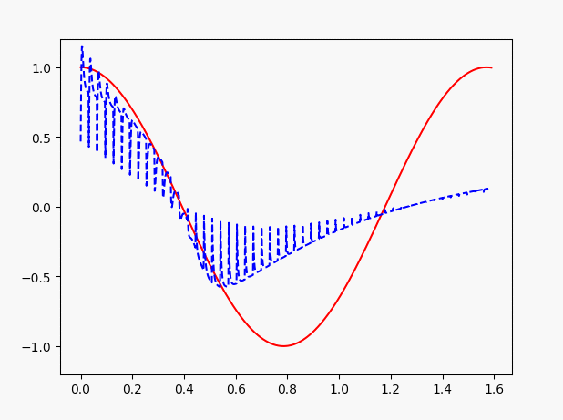 因此,这里需要注意了,LSTM做回归问题的时候,注意观测值与自变量之间不要差距过大。当我们改小一些x的值,可以看到效果如图:
