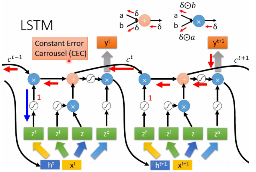 如上,可以通过门的控制,看到红色和蓝色箭头代表的路径下,yt+1的在这个路径下的梯度与上一时刻梯度保持不变。