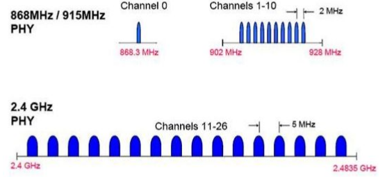 在 915MHz 频段,共有 10 个信道,信道通信速率为 40kbps: