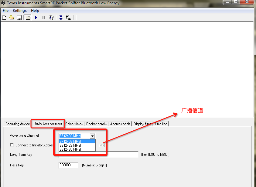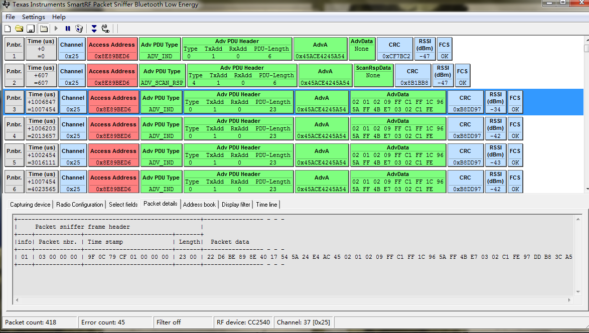 使用德州仪器(TI)CC2540蓝牙低功耗模块配合官方的SmartRF协议软件包监听器:PACKET-SNIFFER,可对三个蓝牙广播信道进行嗅探。