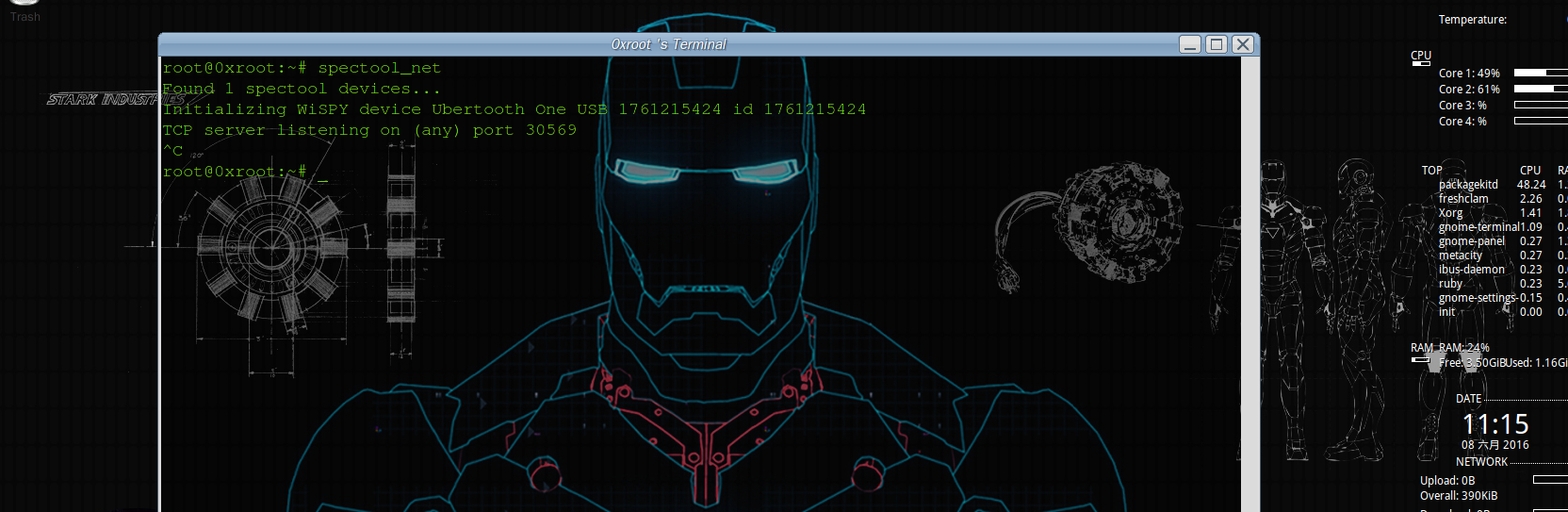 spectool_net 将Ubertooth One作为一台“硬件服务器”,并监听TCP:30569端口,局域网内任何可以跟主机建立通信的PC可通过Ubertoothe主机IP+30569共享设备。连接方式:在另外一台主机终端上执行:spectool_gtk —>选择Open Network Device —>输入ip、端口。