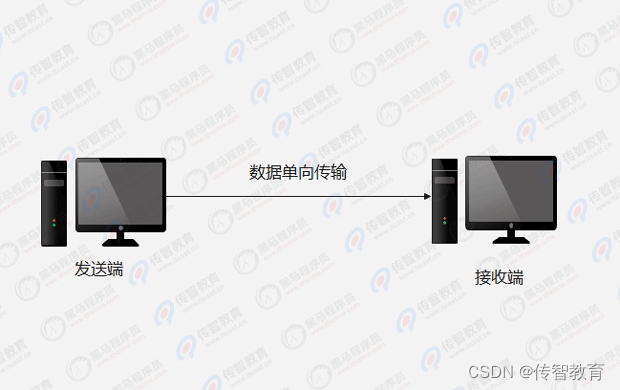 单工通信指在任一时刻,信号只能由通信双方中的端发往另一端,在信道上单向传输。此种方式中信道两端节点的功能固定,发送方只能发送数据,不能接收数据;接收方只能接收数据不能发送数据,如下图所示。