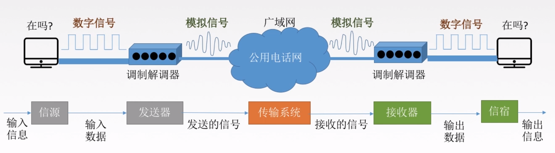 - 信号:数据的电气/电磁的表现,是数据在传输过程中的存在形式。(数字信号:代表消息的参数取值是离散的。模拟信号:代表消息的参数取值是连续的。)