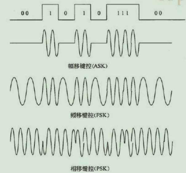 3.模拟通道传送数字数据:数字数据调制为模拟信号,选取某一频率的正弦信号作为载波用以运载所要传送的数字数据。用待传送的数字数据改变载波的幅值、频率或相位,到达目的地后进行分离。