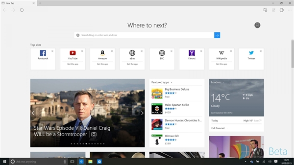 Windows 10抛弃了IE,带来了全新的Edge浏览器。虽然在之前跑分中,Edge浏览器表现抢眼,但是否好用还真是另外一会事。外媒WinBeta带来了最新Windows 10 build 10120系统Edge浏览器的截图,视觉感受和UI设计相当不错,一起感受一下。