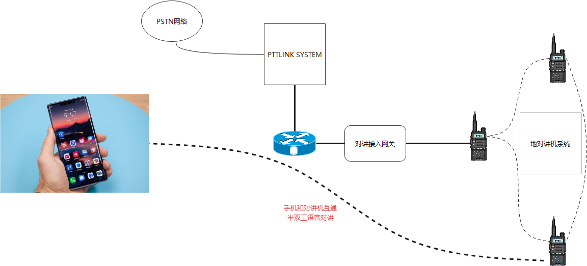 PTTLINK SYSTEM提出的融合通信方案,可以有效解决上述问题,先上拓扑图,再看效果。