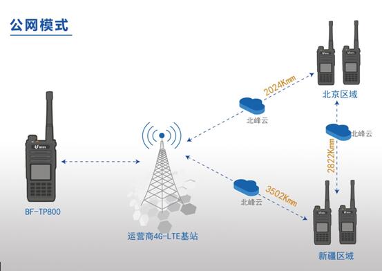 公网模式下:当开启该模式时,专网不开启。出厂时用户可自行选择适配北峰云通信/卓智达/善理/博纳德任一平台。依托公众运营商(移动/联通/电信)网络,形成4G/3G/2G全网实时互通覆盖全国的公网集群对讲系统。