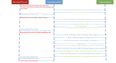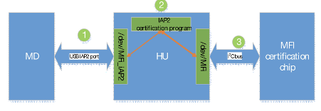 手机与HU通过IAP端口进行通信。认证程序收到对应的认证请求后,通过去挂载在i2c总线上的MFI芯片进行认证,MFI芯片把认证后的数据发送给认证程序。认证程序再发给手机。
