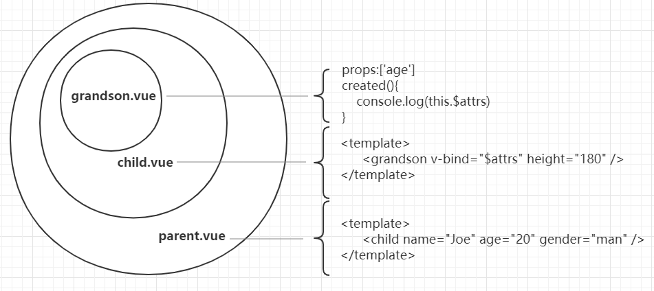 另外可以在 grandson.vue 上通过 v-bind="$attrs", 可以将属性继续向下传递,让 grandson.vue 也能访问到父组件的属性,这在传递多个属性时会显得很便捷,而不用一条条的进行绑定。