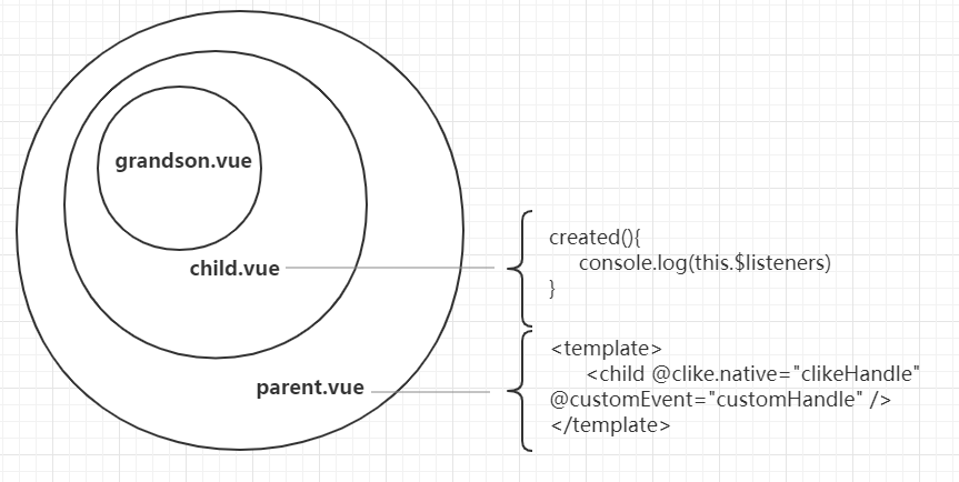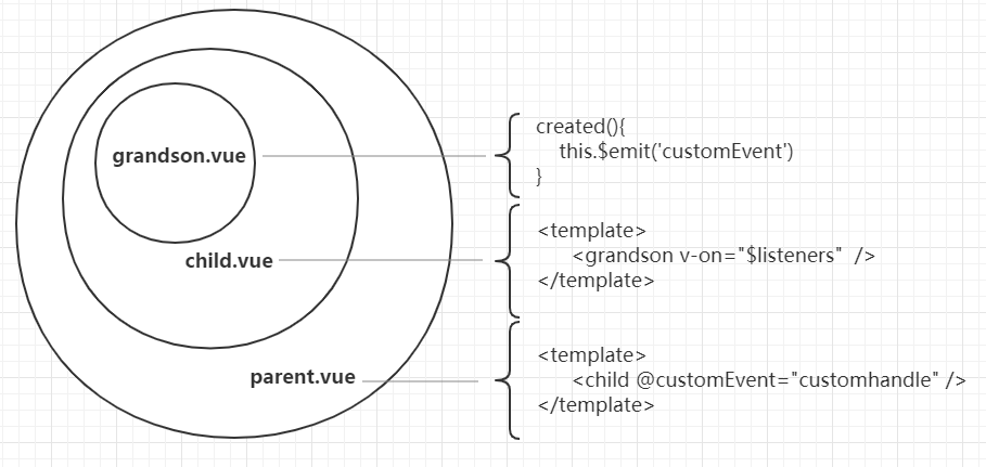 同 attrs 属性一样,可以通过 v-on="$listeners",将事件监听器继续向下传递,让 grandson.vue 访问到事件,且可以使用 $emit 触发 parent.vue 的函数。