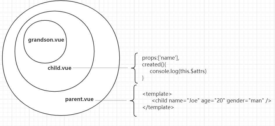 由于child.vue 在 props 中声明了 name 属性,$attrs 中只有age、gender两个属性,输出结果为: