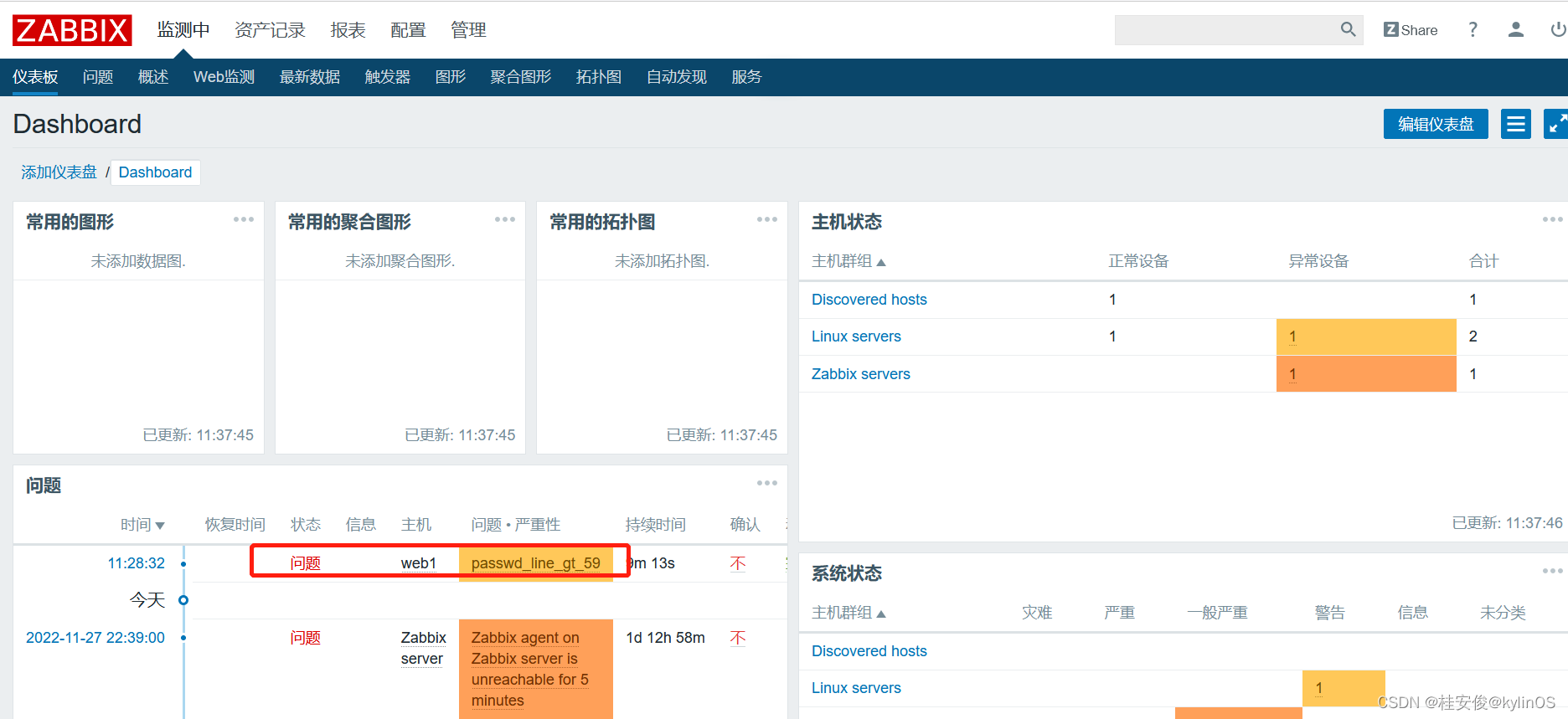 zabbix监控主机方法参见:zabbix模板监控和自定义监控_桂安俊@kylinOS的博客-CSDN博客