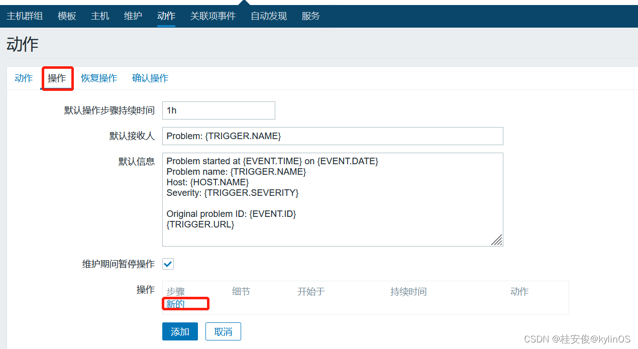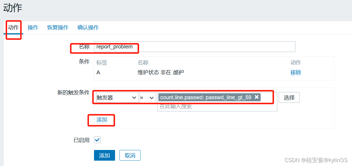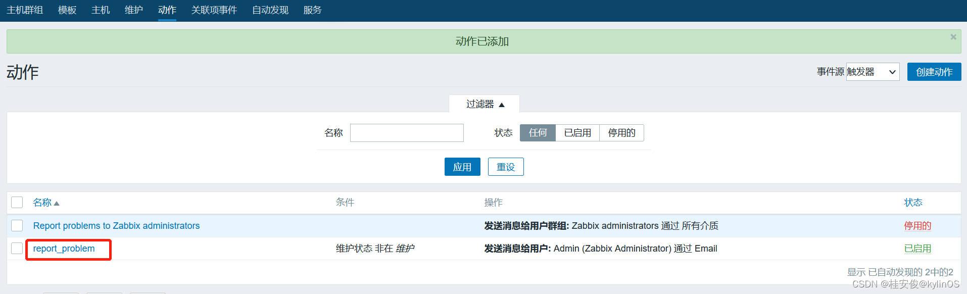 至此,触发器配置完成,下面就是给触发器配置报警动作。