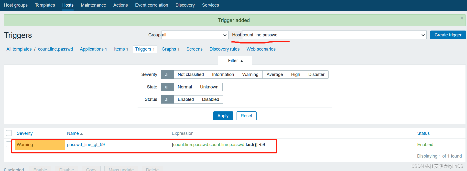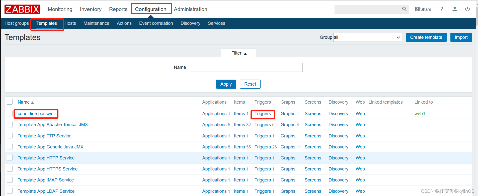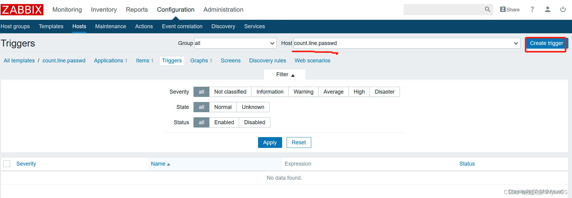 Configuration--->Templates,选择想要添加触发器的模板,比如这里之前创建的count.line.passwd,点击后面的Triggers: