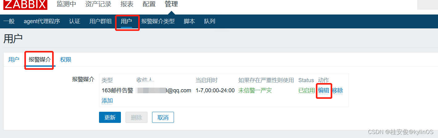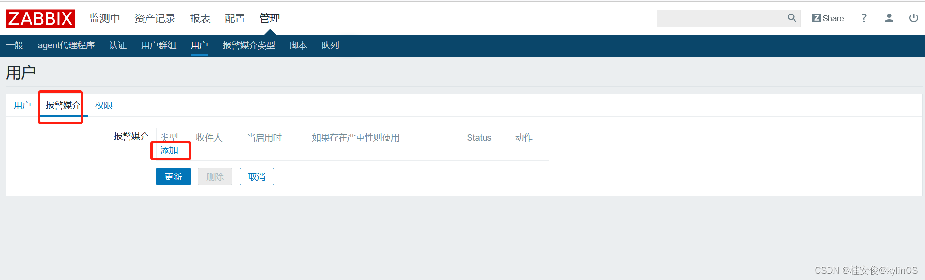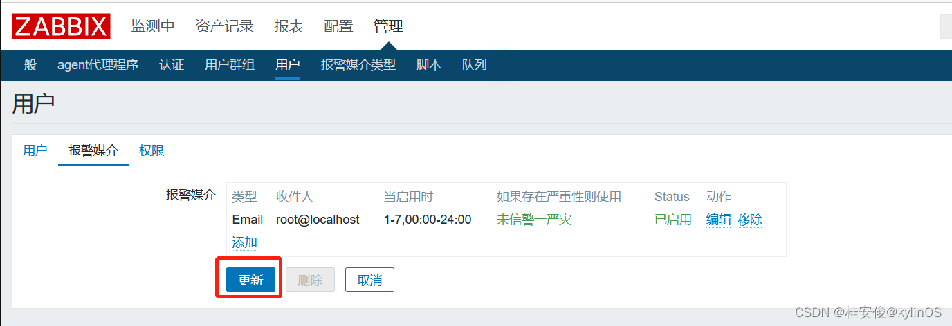 点击Admin,选择报警媒介,添加: