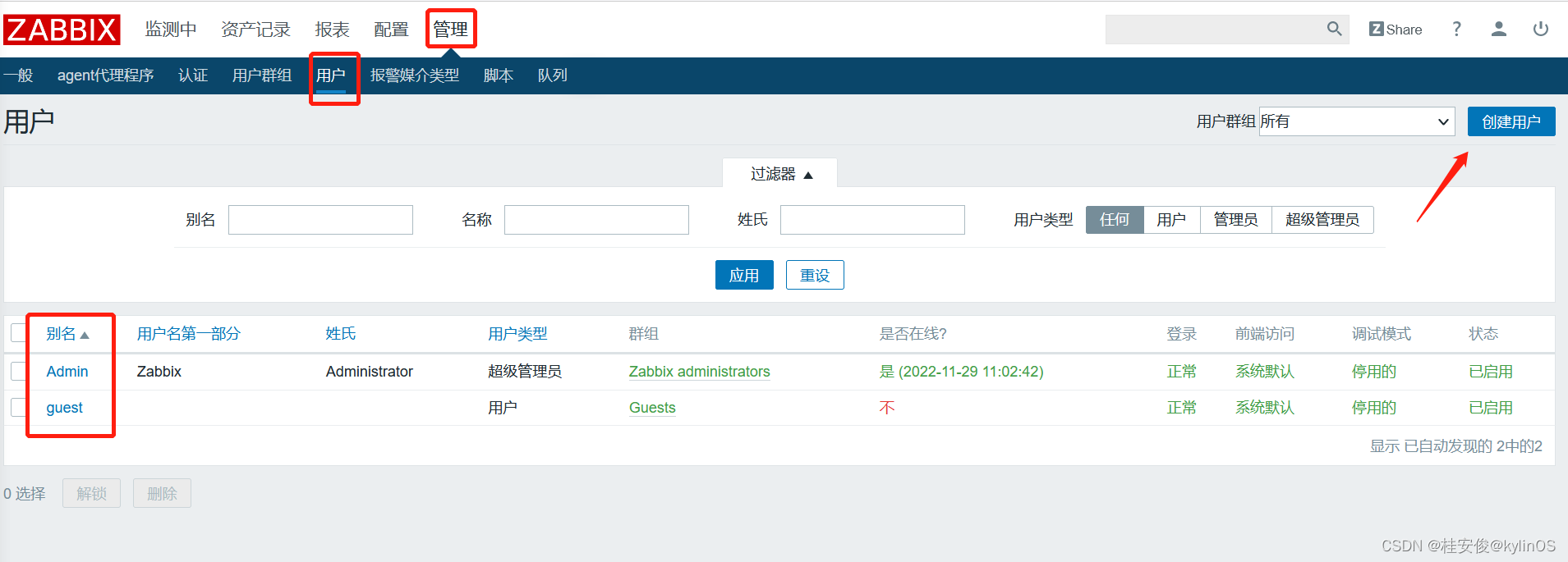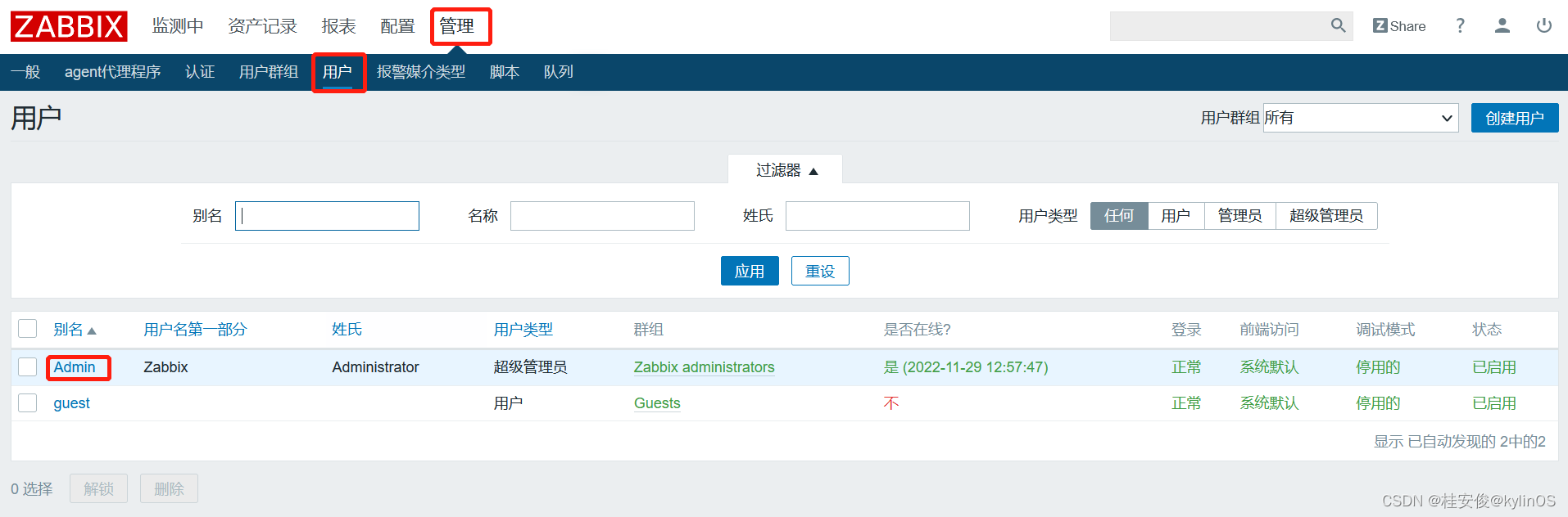管理--->用户,zabbix默认自带了2个用户,也可以右上角创建用户,这里我们使用Admin管理员用户: