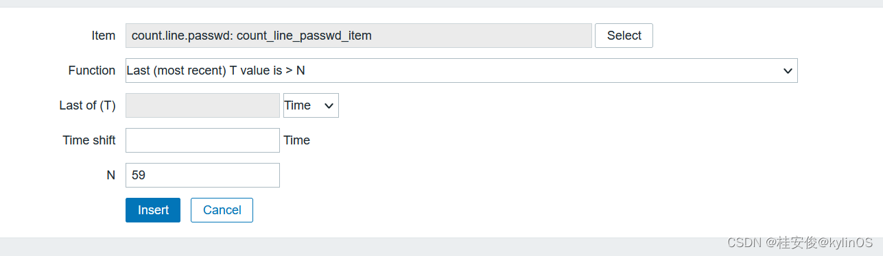 如下图是表达式选择页面,Item是选择实际监控数据;Function是选择函数,这里是默认值,查看最新数据是否大于N;N的具体数值是在最下面设置,这里设置59(因为当前web1是56个用户,这里设置如果判断是否大于59,待会可以手动给web1增加到60个用户,用于测试触发器);Last是最后多少个,因为这里Function选的是最新数值,所以不存在最后多少个,所以Last是灰色不可选状态;Time shift是时间偏移量,可以不设置;