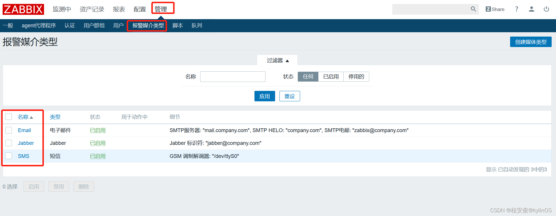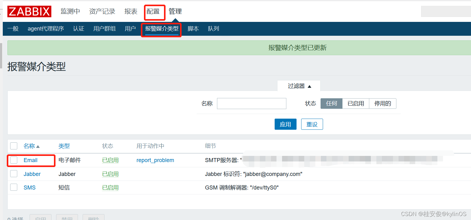 2、在zabbix中管理报警媒介,设置邮件发送服务器
