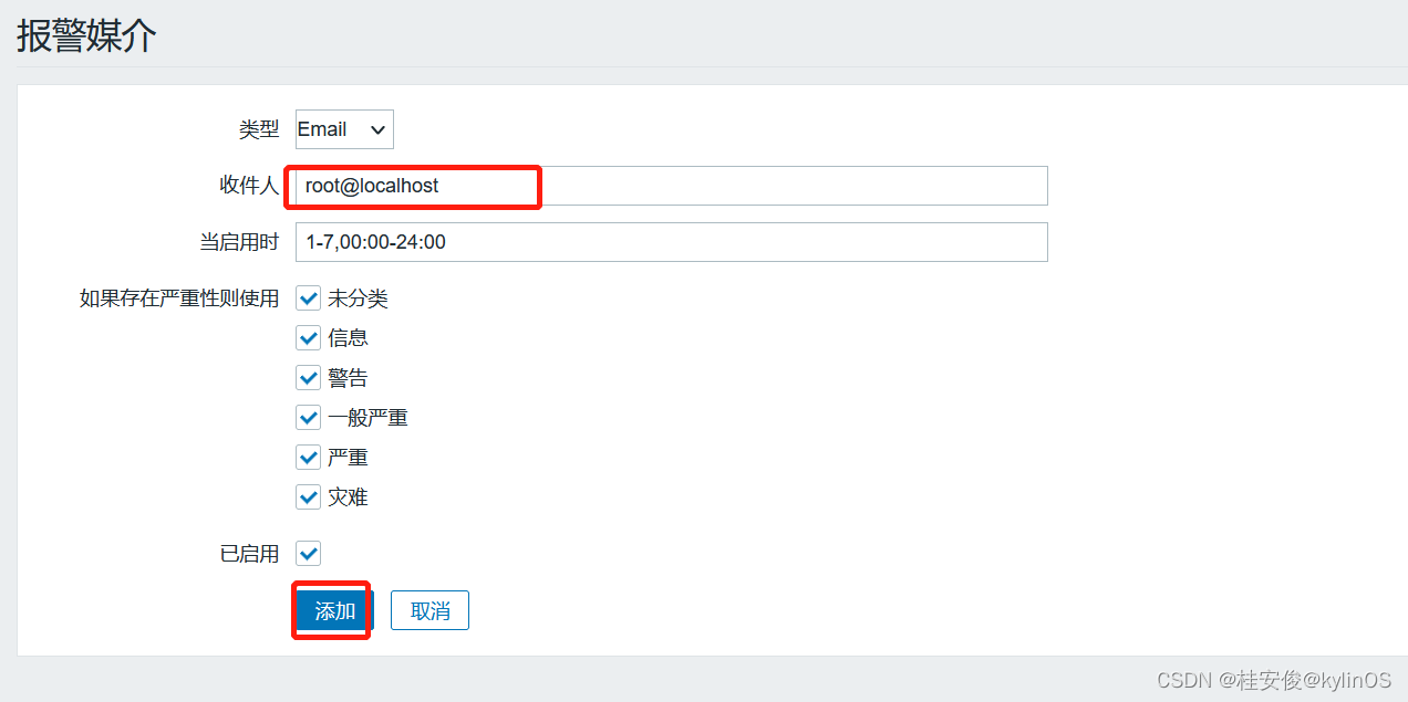 如下图,设置报警媒介,这里选择使用Email类型,因为使用的是本机自带的Postfix邮件服务器,所以设置收件人为本地root用户;当前启用时指什么时间段可以发邮件,比如如图所示的周一到周七,0点-24点,7x24小时可以发送邮件;最下面是指当遇到什么严重级别的问题才会发邮件,这个根据需求自定义选择: