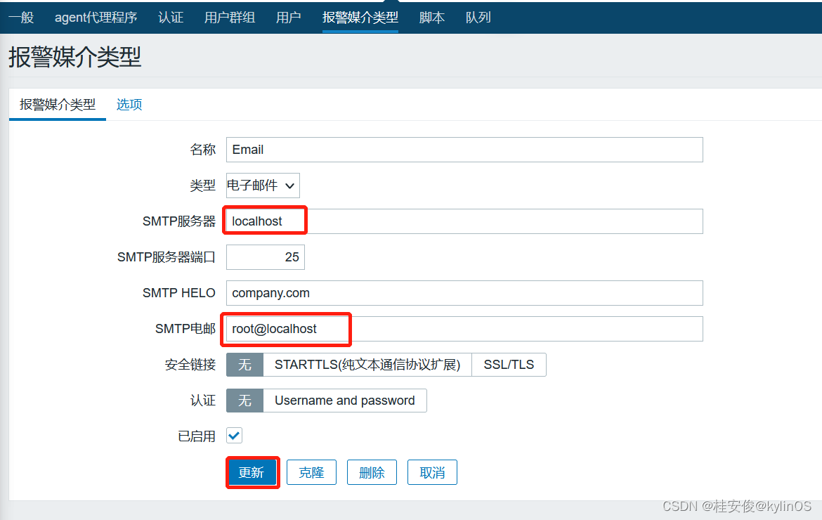 这里使用Linux系统自带的Postfix作为邮件服务器,所以SMTP服务器设置localhost,如下图, SMTP电邮设置为root@localhost,即自己发给自己,所以下面也不用设置用户和密码,如果zabbixserver可以连接外网,也可以发送给外网邮箱,比如163、qq邮箱等,如果是外网第三方邮箱,下面所有的地址、账户、加密设置都需根据实际对于的邮件服务器厂商的要求进行配置,可以百度搜索对于配置方法: