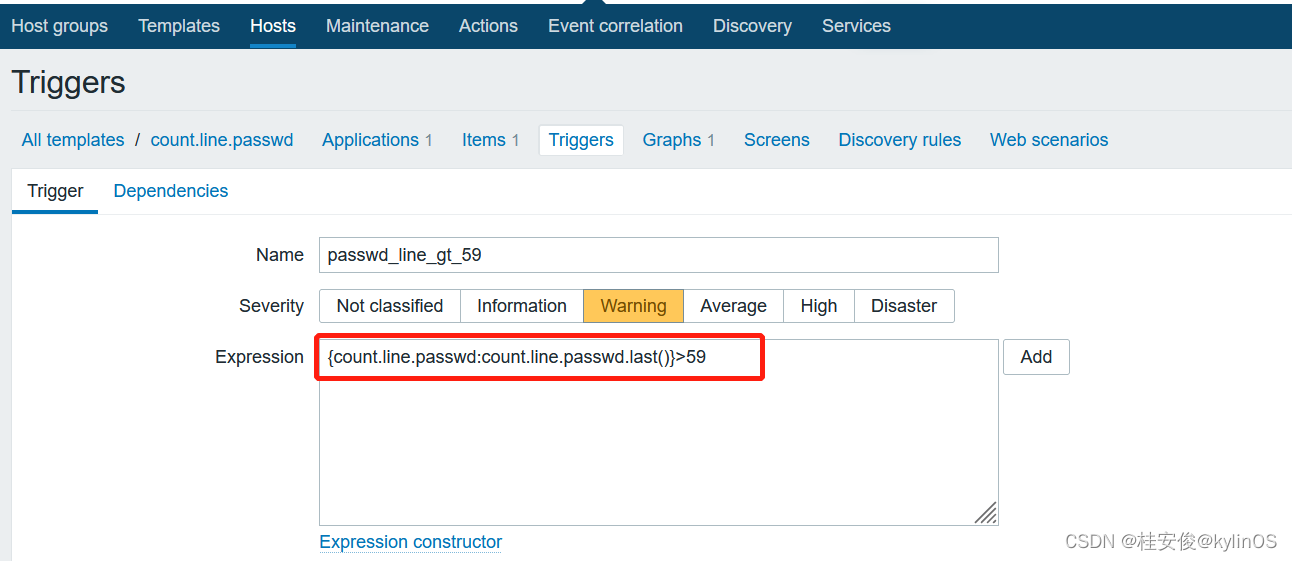 如下图,Name为自定义触发器名称,Severity为选择触发器报警等级,Expression触发器表达式,这里可以手动输入,也可以选择后面的Add进行页面选择: