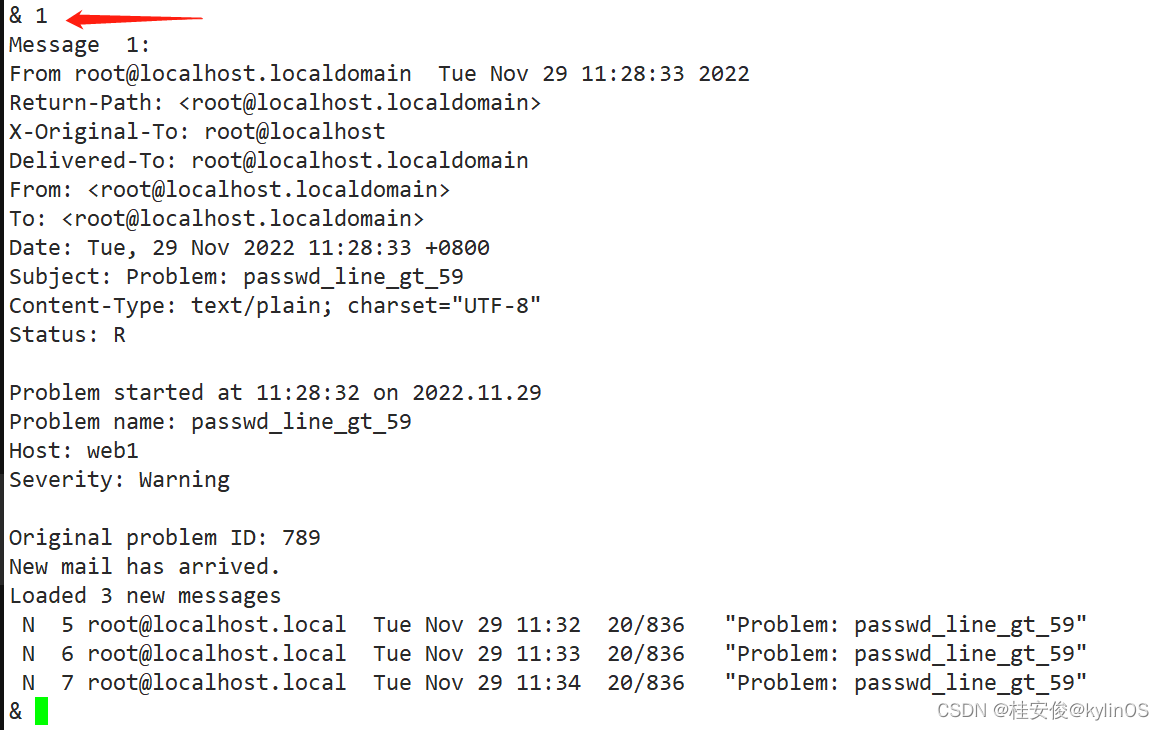 如上可以看到有3封未读的邮件,邮件标题都是Problem:passwd_line_gt_59,选择前面的邮件编号,按回车,可以查看指定编号邮件内容,这里输入1,回车,查看第一封邮件内容: