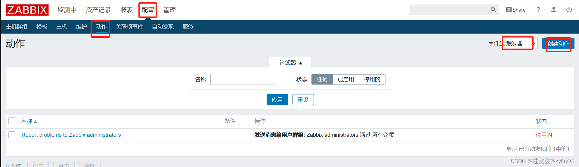 配置--->动作--->事件源选择“触发器”--->创建动作: