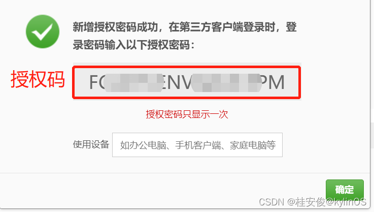 如果忘记保存,可在下面的授权码管理里面重新添加授权码,每次添加过程都会明文显示一次: