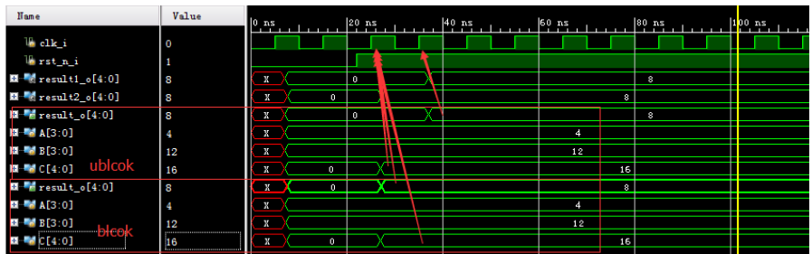 阻塞和非阻塞赋值:通过阻塞的方法提前得到 C 的值,再将 C 右移 1 位,达到除以 2 的效果。整个过程耗时一个时钟。