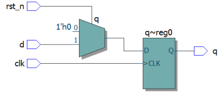 我们可以看到寄存器有一个异步的清零端(CLR),在异步复位的设计中这个端口一般就是接低电平有效的复位信号rst_n。如果我们设计的是高电平复位,那么实际综合后会也会将该复位信号反向后接这个CLR端。