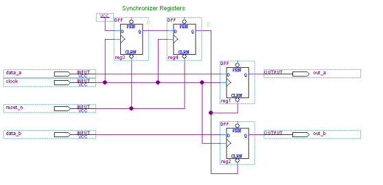 观察这个电路图可以看出reset_n接到两个异步复位寄存器的清零端(CLRN端接低电平的时候寄存器输出端会清零),当reset_n为0 时,寄存器reg3和寄存器reg4输出为0;由于寄存器reg1和寄存器reg2的CLRN端接到了寄存器reg4的输出端,所以寄存器输出端out_a和out_b会被清零,从而实现复位清零的功能。在reset_n由低变高时,第一个时钟周期将VCC输入到左边第一个寄存器,第二个寄存器保持为0,在第二个时钟周期后两个寄存器都变为1,输出端寄存器的清零端为1,跳出复位。