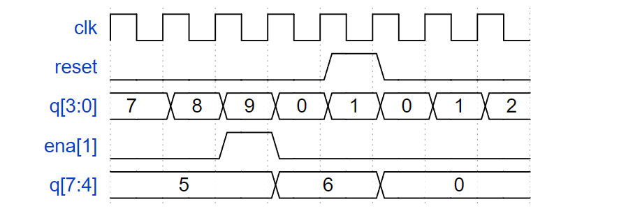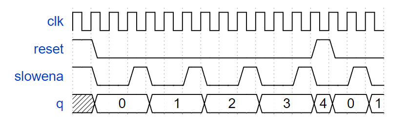 要求:构建一个从 0 到 9 计数的十进制计数器,周期为 10。复位输入是同步的,应该将计数器复位为 0。我们希望能够暂停计数器,而不是总是在每个时钟周期递增,所以slowena输入指示计数器何时应该增加。