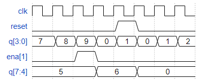 构建一个4位BCD(二进制编码的十进制)计数器。每个十进制数字使用4位进行编码:q[3:0]是个位,q[7:4]是十位,以此类推。各进制上的进位时也需输出一个使能信号,指示三位数字何时应该增加。