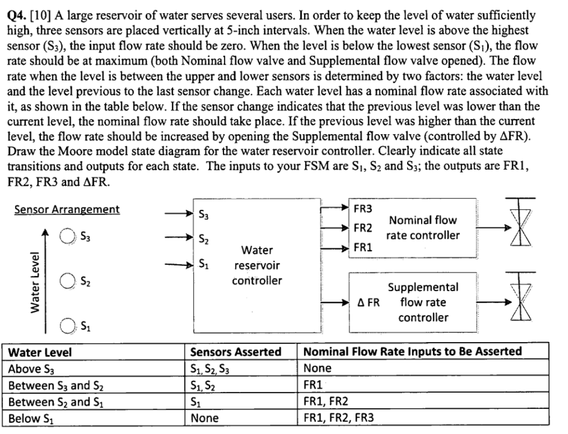 Also include an active-high synchronous reset that resets the state machine to a state equivalent to if the water level had been low for a long time (no sensors asserted, and all four outputs asserted).