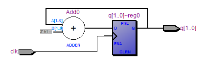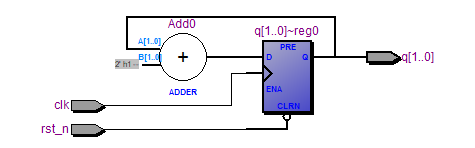 代码 2-1 是一个时序逻辑单元,它应该被综合成一个计数器,每当时钟的上升沿,q 自增一。综合后的 部分 RTL 图如下: