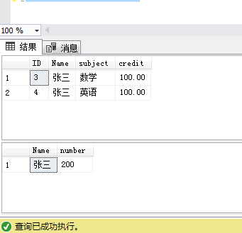 insert into [dbo].[Stu]([Name],[subject],[credit]) values('张三','数学',100),('张三','英语',100)