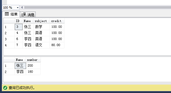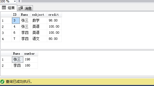 insert into [dbo].[Stu]([Name],[subject],[credit]) values('张三','体育',60),('李四','英语',100),('李四','语文',80)