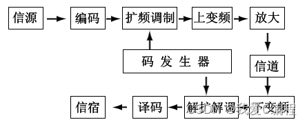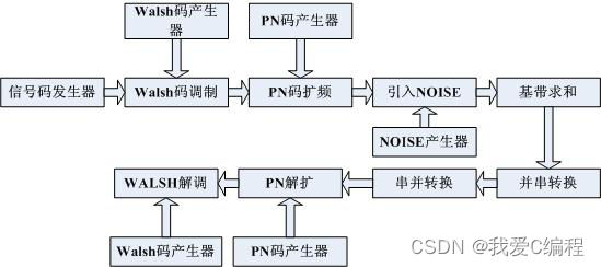 CDMA技术是以扩频通信为基础的载波调制和多址接入技术,所以如何实现扩频部分对于整个CDMA系统的实现有着重要的影响。下图是CDMA系统的基本原理图: