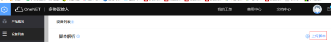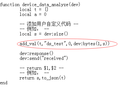 可从onenet平台上下载,脚本中最重要的两个函数,根据需要修改,本例子中,只是把上传的数据解析为ds_test数据存在onenet平台上,每收到一包数据,就返回给终端一个received字符串。