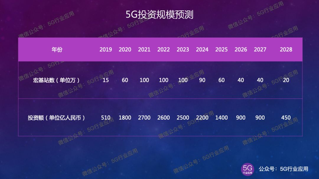 除了宏站投资,5G发展还涉及大量小微基站、光传输、核心网、多接入边缘计算等投入。预计中国5G投资周期十年,总投资金额1.6万亿。具体参考微信公众号“5G行业应用”的《5G发展的五大动力和四大挑战》文章分析。