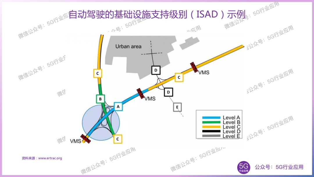 E级别最低,无数字化信息,不支持自动驾驶的传统基础设施,完全依赖于自动驾驶车辆本身;D级别支持静态道路标识在内的静态数字化信息,而交通信号灯、短期道路工程和可变信息交通标识牌需要自动驾驶车辆识别;C级别支持静态和动态基础设施信息,包括可变信息交通标识牌、告警、事故、天气等;B级别支持协同感知,即可感知微观交通情况;A级别支持协同驾驶,数字化基础设施可以引导自动驾驶车辆的速度、间距、车道。