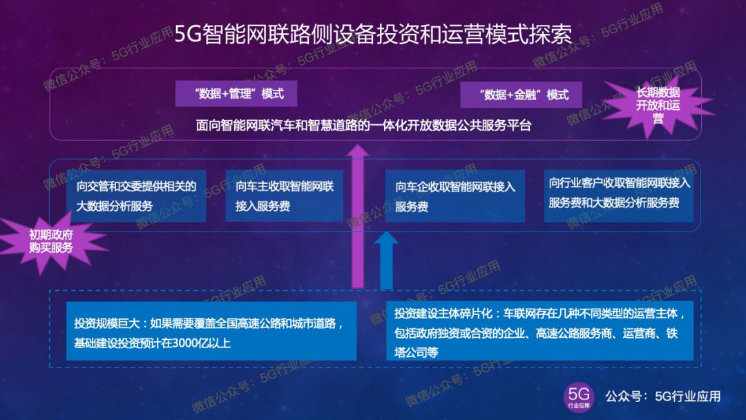 5G智能网联路侧设备,除了4G/5G蜂窝基站明确由运营商投资建设外,RSU、路侧智能设施、MEC涉及的投资规模巨大,投资建设主体碎片化。微信公众号“5G行业应用”的《5G车联网产业发展的冷思考》文章中,详细介绍了车联网商业模式面临的挑战。