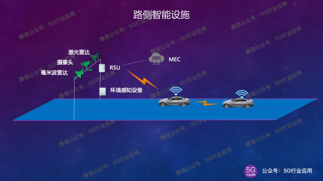 5G智能网联路侧基础设施主要包括①通信基础设施:4G/5G蜂窝基站;②C-V2X专用通信基础设施:多形态的RSU(Road Side Unit);③路侧智能设施:包括交通控制设施(交通信号灯、标志、标线、护栏等)智能化,以及在路侧部署摄像头、毫米波雷达、激光雷达和各类环境感知设备;④MEC(多接入边缘计算/移动边缘计算)设备。