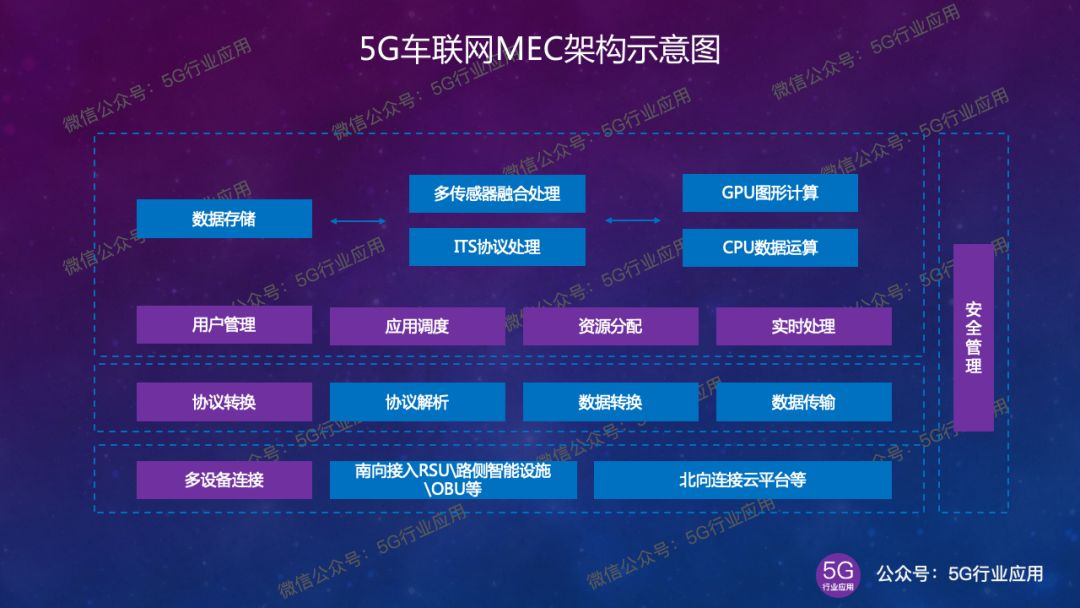 5G车联网MEC需要具备多设备连接能力,接入RSU、OBU、智能化交通控制设施(交通信号灯、标志、标线、护栏等)、摄像头、毫米波雷达、激光雷达、各类环境感知设备的信息,同时向上连接云平台;MEC需要具备多传感器融合处理能力,比如摄像头+激光雷达+毫米波雷达融合分析算法;MEC还需要具备ITS相关协议处理能力,比如针对交叉路口防碰撞预警业务,在车辆经过交叉路口时,MEC通过对车辆位置、速度及轨迹分析研判,分析出可能存在的碰撞风险,通过RSU传输到车辆OBU,起到预警目的。