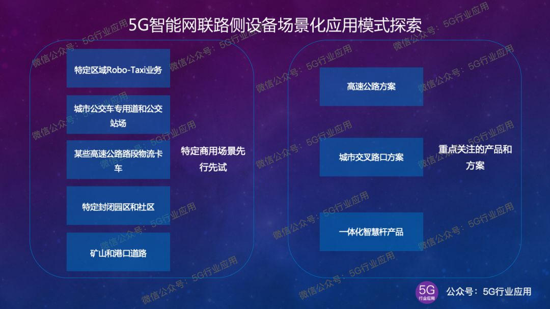 ②其次在特定商用场景先行先试,如特定出租车区域、城市公交车专用道和公交站场、某些高速公路路段、特定封闭园区和社区、矿山和港口等部署C-V2X和5G网络,实现V2I(车-基础设施)业务场景,如闯红灯预警、绿波车速引导等;