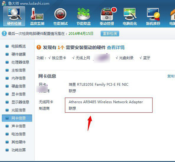 在笔记本中安装一个鲁大师软件,然后打开后,在硬件检测中,就可以看到有无无线网卡了,如下图所示: