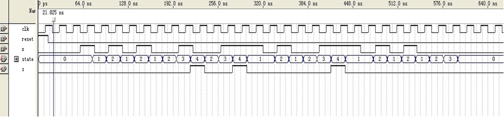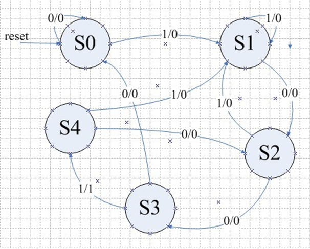初始状态设为s0,此时检测数据序列为“0000”,当再检测到一个0时,仍为s0,当检测到1时,进入下一个状态s1,此时序列为“0001”;当在状态s1检测到0时,进入到状态s2,此时序列为“0010”,当检测到1时,仍为s1;当在状态s2检测到0时,进入到状态s3,此时序列为“0100”,当检测到1时,进入s1;当在状态s3检测到0时,进入s0,当检测到1时,进入状态s4,此时序列为“1001”,结果输出为1;当在s4检测到0时,进入状态s2,当检测到1时,进入状态s1。状态图如下:
